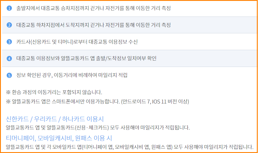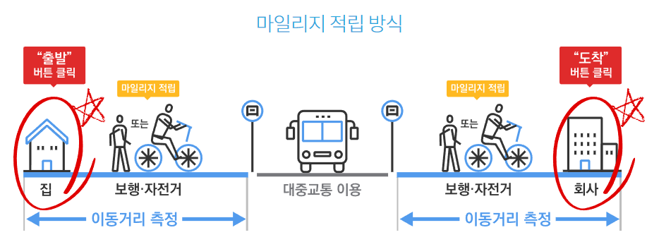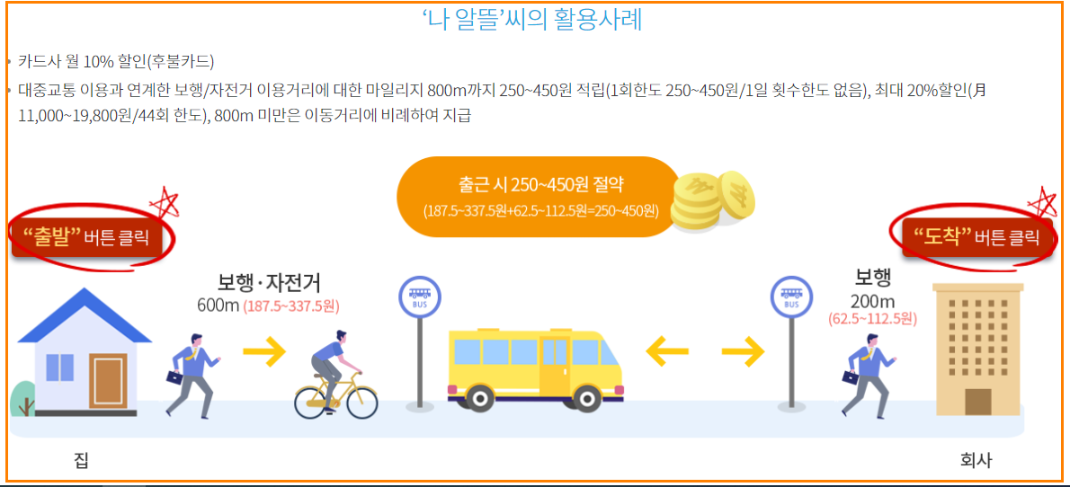 대중교통을 이용하기 위해 걷거나 자전거로 이동한 거리만큼 마일리지를 적립하여 지급하고, 아울러 카드사의 추가할인 혜택을 포함하여 대중교통비를 최대30% 까지 절감할 수 있는 교통카드